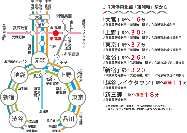 JR武蔵野線は東西に走る路線のため、各主要路線への乗り換えとなる駅を経由する便利な路線です。