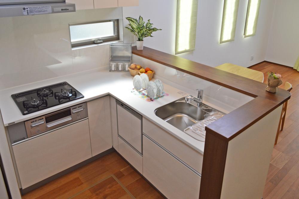 人造大理石ワークトップ、浄水器内臓シャワーヘッド、食洗機、三口コンロ(ガスの場合はガラストップ)は、どのメーカーでも標準仕様としています。